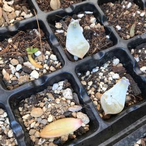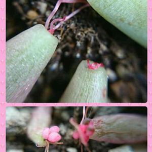 1ヶ月前に葉挿しを目指して取った葉に ようやく発根、芽も出てきた。 もうお水開始でいいのかなぁ~? 右下のは双子ちゃんなのかしら? でも残念ながら誰だかわからない…😅💦
