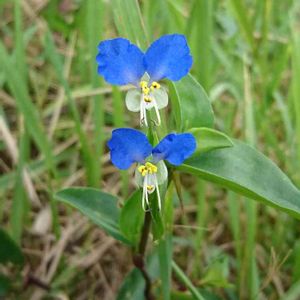 草むらで露草が、少し珍しい咲き方をしていました。 露草は、大体一株に一日一輪だけ花を咲かせる事が多いですが、この株は二輪の花を同時に咲かせています。 しかも、こんな風に縦にならんで咲いているのは、初めて見ました😲
