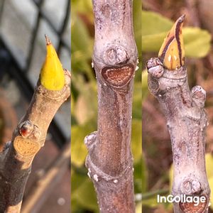 1/11 新津丘陵 ❄️クイズ冬芽葉痕❄️、クイズです。 ✌️✌️✌️😃😃😃✌️✌️✌️ 雌雄異株です。 ⬆️は雄株、↕️⬇️は雌株で同じ木です。 『落葉小高木。裸芽、褐色の毛が密生する。頂芽は卵形、球形~卵状楕円形で長さ3~10ミリ、側芽は球形~卵形で小さい。葉痕は大きく、心形~三角形。維管束痕は多数、V字状に並ぶ』 芽吹きの姿は、オイラ好きです。花は地味で、紅葉します。かぶれます。 ✌️✌️✌️😃😃😃✌️✌️✌️ 冬芽も大きいし、葉痕も個性的です。でもオイラは、果実の殻を見て、やっと同定に安心しています。 【追記】 ヤマウルシ(山漆)ウルシ科ウルシ属の落葉低木