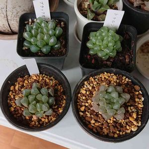 左上、黒オブツーサ 右上、オブツーサ 左下、黒オブ×紫オブ 右下、紫オブツーサ メルカリで購入した紫オブが届いた記念に 各種並べて撮ってみました✨ 紫オブ以外は前からいる子たちなので 写っている以外にも株分けして増やしたのが、もっともっとおります… つぶつぶキラキラ、集めたくなるのは 止められないわ😓