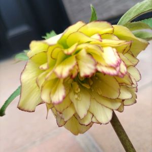「クリスマスローズ ダブル イエロー」 可愛さについついお迎えしました💛⸒⸒ (以前のが消えたので……) ピンクの縁取りがかわいい🩷 ̖́- お花が終わったら植え替えよう