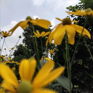 おはようございます🎋 💛黄色い花二種💛 水車公園で夏空に 名前🔍️けどよくわからない 今週もよろしくお願いいたします🙇🤗