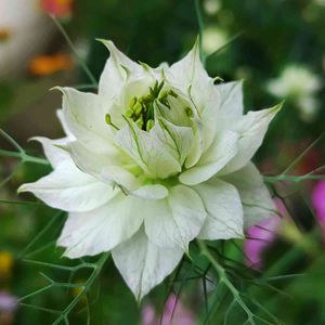 ⭐白くなったニゲラ⭐ お友達からピンクのニゲラだよ💗ってポットに入った苗を頂いて✌ そのまま玄関で育てたら、白になっちゃった😆 お友達👩ごめんなさい🙏 地植えすれば良かったね🌿