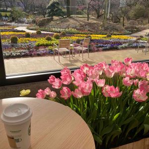 チューリップ モンテオレンジ🍊が満開で綺麗です🌷🌷🌷 トリトンさん🐬✨の 🏷日曜ビタミンカラー♪ に参加しています🙋💛✨ 昨日はポカポカで行楽日和でした🚘💨🏞😊💕🎶✨ HANA BIYORIスタバ前で🤳☕😃🎶
