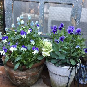 ブルーのビオラ達、ブラックだった葉牡丹シルキーパールも緑色になっちゃった。