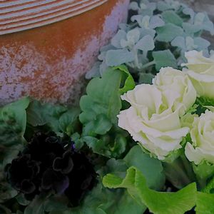 春らしくない寄せ植えです 秋の寄せ植えを解体した後に葉物を残して植えたコウロギノブコさんのビオラたち 女郎蜘蛛のようなビオラが個性的