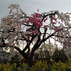 垣根のむこうの一本の木。枝垂れ梅?枝垂れ桜?枝垂れ桃? 名前を教えて頂きました。 源平咲き枝垂れ花桃。 今日の花のモモの仲間に入れてもらえますか?