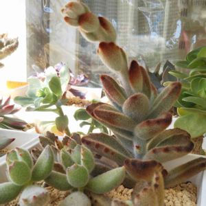 テディベア🐻カランコエ たぶんの花芽がニョロンと伸びてる😆 下の方に小さく出てる脇芽を育てたいので 🙏✂️しちゃうかもだけど記録用に📸 奥の薄化粧の蕾には可愛いお花を期待してマス✨