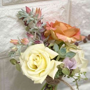 多肉植物のニョロンちゃんでブーケを作ってみました💐 わたし的には、可愛い💓って思ったのですが、お姑さんには不評でした😅 ハハハ…… 好きな物を全部集めただけ😂