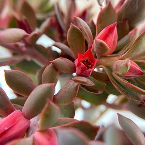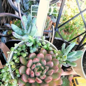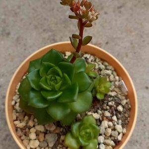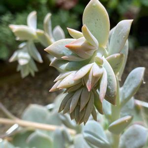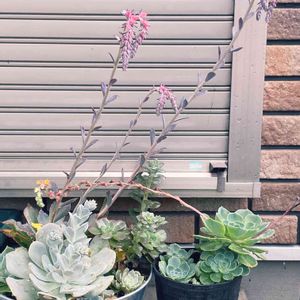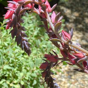 なおさんの 🏷ニョロン(26日)の日、初参加は ⚛️ダスティーローズ⚛️ (エケベリア) 一体 どこまで〜いつまで〜 🐍ニョロ〜〜〜ン🐍 3連発で 咲くんかいな そろそろ ✂️かな