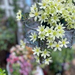 こんにちは😊 クレマチス ペトリエイ🌸 カートマニージョーよりひと足先に咲き始めました💕💕 吊るしているのでゆらゆら可愛い〜😍