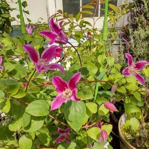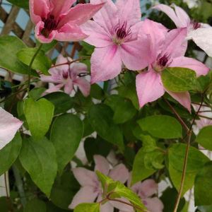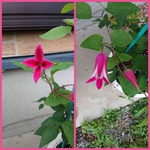 クレマチス🌼🌿⑤⑥ ⬅️ タグを失くし不明な品種 もう6年以上前から半八重咲きで、薄紫色の花が沢山咲いてくれます💕 ➡️ ビル・ド・リヨン 濃いピンク色に縁に赤色が入る華やかな品種💗❤️ 日陰になってしまい、花つきは少なくなってしまいました💦