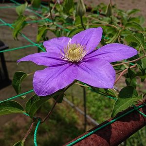 🌺ビニールハウスの使って無いアーチ2本に100均の野菜ネットを貼ってクレマチスを這わせて見たよ。 ・・・アーチの最上部で上向きに咲いた 下からは見えない。 ・・・そぅ言うオチでした。