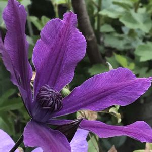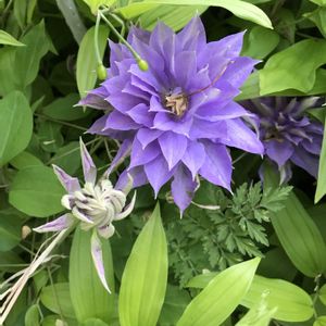 22℃(7:05)曇り空 なんか暖かい朝です クレマチス ①福園 木立ち性 けっこう花大きい♡ ②マジカルブルー ①に似てる?