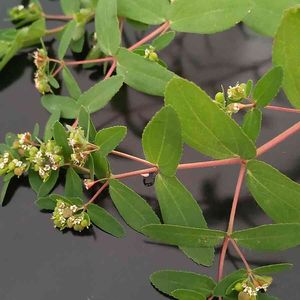 不思議な植物「オオニシキソウ」 コニシキソウとは違う仲間 茎は立ってます! 葉はユキヤナギかな?に、似てます! 白いちびっこい花が咲いてて、、、あれれ?これな~に? 白い花の先にオシベ。果実に見える先にメシベ。 あまりにも小さくてピント合わないので、家の中で撮りました📱