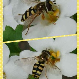 ごめんなさい、昆虫です🙇💦💦 昨日のステラ(バコパ)に訪問中!🐝 フタホシヒラタアブ、と出ましたが❔❔ 背中がピカピカ❇️✨して綺麗ですね😉 前脚を一生懸命すりすり、こすってましたー🐝 すりすりして脚に付いた汚れを落として身繕い。 ハエや蜂、アブは脚先でも味を感じることが できるとか…😮😮 お手入れかかせないんですね!