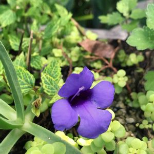 名前が不明です。 小さな葉っぱ 黄色の斑がああり 紫の可憐な花が咲きます。