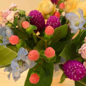 ヒペリカムの実でしょうか? この12月に数十年のサラリーマン生活を終えて、新しい仕事を始める旦那が、先日、会社の送別会でいただいて来ました😊💕 とても可愛い色です☺️ 今日は19日💕 ピンクの日に参加させていただきます😉💕