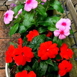 雨☔️で…気分が沈みがちになる・・ 暖色系のお花➖ニューギニアインパチェンスの朱赤と、日々草のピンク色〜🎶💖😊 見てると自然と元気が出てくる💪💨💨😁