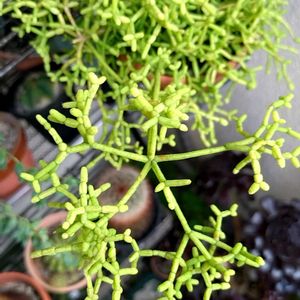 ■Rhipsalis Puniceodiscus ・リプサリス プニセオディスカス ペチコートを買った時、いっしょにお迎えしたプニセオディスカス。ちょっと珍しいかも。花がかわいいので見てみたい。1シーズンでどれだけ成長するか楽しみです☺ (AI情報) 特徴 ・別名: レッドミストルカクタス(Red Mistletoe Cactus)とも呼ばれます。 ・形態: 細長く垂れ下がる茎が特徴的な多肉植物です。まるで長い髪の毛のように垂れ下がり、観賞価値が高いです。 ・花: 夏には小さく、白や黄緑色、または白と黄緑色が混ざったような花を咲かせます。 ・実: 花の後には黄色い丸い実をつけます。 ・原産地: 中央アメリカと南アメリカが原産とされています。一部の情報ではブラジル原産ともされています。 最高気温22℃、最低気温10℃