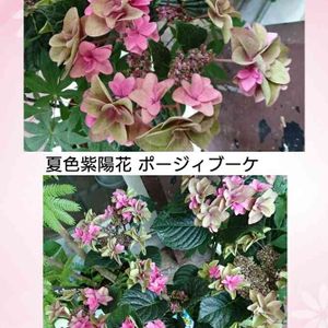6/24日① ☆紫陽花☆ ピンク色のナデシコアジサイと オタフクアジサイ(左上、右下) おはようございます(^o^)/ 今朝も雨模様なので爽やかなピンク色の撫子紫陽花。ギザギザした縁がレースみたいで乙女な感じで可愛いですね(*´∇`*) ちょっと今日は紫陽花picで遊んでみますね♪♪