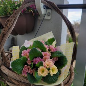 娘の卒業祝にお母さん頑張ったで賞を同僚から頂きました😍🎉 カゴ🧺を編んでお花をラッピングしてと多才な方から😋 子供は色んな方から祝って貰えるけど頑張ったお母さんはわりと誰からも何も無し😂なので嬉しい🤗⤴️💓 このプリムラいい匂いがします💘