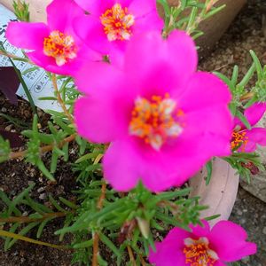 マツバボタン 植木鉢の隅っこから芽が出て花が咲きました🎶 何処からか種が飛んできたのか、買った球根の袋に種が着いていた?