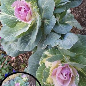 レディは御二方共濃い色に♡ 真っ白なグリーンアイスは義叔母から頂き✨横にコソッとブラキカム🎶 葉牡丹は花束で頂いた時は濃いピンクだったのが、この気候では淡いピンクまでで限界かな😆