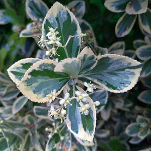 斑入りの葉っぱが美しい🌿マサキ🌿に、小さなお花が咲いていました🥰💕