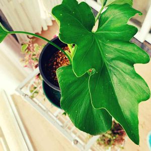 おはようございます☀ フィロデン ドロン属のライム系です🪴 朝の光で黄緑色が綺麗です😉 今日も一日ボチボチ頑張りましょう☺️