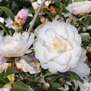 山茶花*+:•*”:♡. 実家に咲いてます♪ 白い山茶花も清楚でいいですよね( •̤ᴗ•̤ )♡ 白い山茶花の花言葉 「愛嬌」 「あなたは私の愛を退ける」 愛嬌あるのに〜😅
