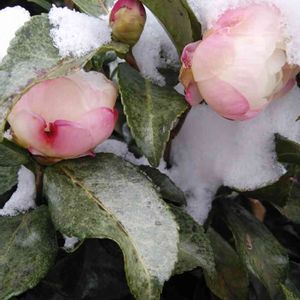 こちらは 休む暇も無く音もなし❄が 積もっております(@_@) ❄にかぶった 🌹山茶花🌹です。