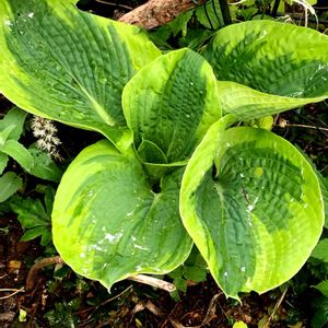 ギボウシ・フランシスウィリアムズ 青みがかった緑に黄緑の斑入り 大型の定番品種です❁⃘*.゚ ホスタは、食用にもできるので美味しいのか虫に食べられちゃう 控えめにオルトラン撒いてます 一番好きなホスタですキュン💘