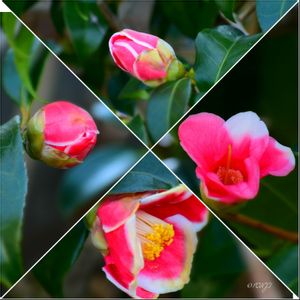 〓深夜の投稿便🚚〓 <ソロソロ開きます🌺> 先日伺った枝垂れ梅で有名な光受寺に咲く椿ですが、 枝の所々には蕾からはじまり、半開きの花まで様々😅 色々コラしてみました😆⤴️💓👍️