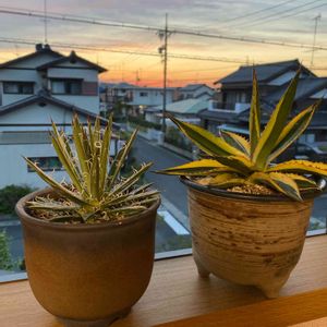 こんばんは🌄 やれやれ1週間のお仕事終わりました〜~ いつもの窓辺…夕陽がいい感じですので 和鉢アガベと(^^)