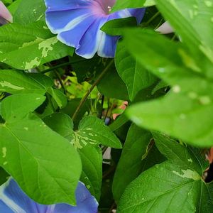 おはようございます。 朝顔を、もう、1枚。 雨上がりなのか、花が 綺麗に咲いています。 元気な葉っぱに、邪魔されてお顔が半分です。 ピンクと、藍色も、咲いています。 種蒔きからの朝顔です。 葉に斑が入ってます。 アメリカでは、オールスター野球に、大谷君が、1番バッターで、出ています。 初球を、センターにヒットしました。 頑張れ👊😆🎵 大谷君‼️