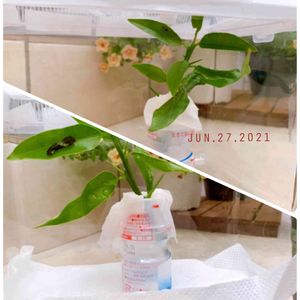金柑の木に産みつけられたアゲハチョウを 飼育しています‼️(虫が苦手な方ごめんなさい💦) 1週間、なんとか無事に大きくなっています😅 アドバイスくださった皆様、ありがとうございました😆これで、大丈夫ですか?💦 「ちょうちょになるのを見届けたい❣️」と言ったのは小学生の娘なのに 結局お世話は、わたしがやることに😵 すでに愛着が湧いてきました💕 【あーちゃん】と名付けました🦋