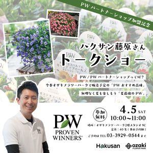 PWパートナーショップ 加盟記念! オザキフラワーパークさんでハクサンの藤原さんがトークショーを開催します。 【場所】オザキフラワーパーク 〒177-0045 東京都練馬区石神井台4-6-32 【日時】4/5(土) 10:00~11:00 【定員】先着40名様 予約はTEL:03-3929-0544までお願いします。