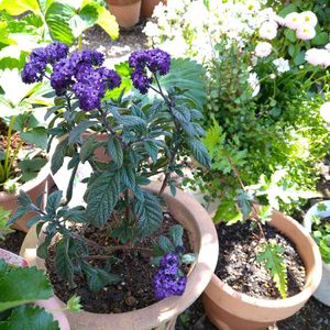 おはようございます。 春から比べると香りが 少ないように感じます。 ➡️白いヘリオトロープは春に小さな苗にお迎え ⬅️は3年目の苗です。 これから陽当たりの良い玄関前に移動します✋🍀 (真夏、真冬に神経を使いますね😅)