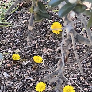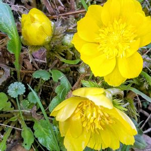 福寿草が2輪咲いてました💛💛 節分の日には既に咲いていたのね💗🎶 ふと見ると、隣にダイコンソウが👀💜✨ 正式名称何だったかしら💦 ロウバイの花も満開です🟡🟡🟡🟡🟡🟡🟡日に当たっているところは内側が紅いのね(*^^*)