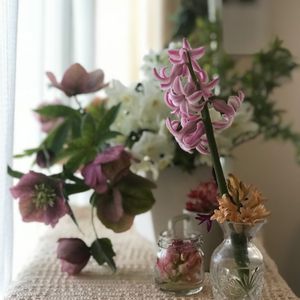 庭の花を摘んで💐 クリスマスローズ、白い水仙、リナリア、蕾のコデマリ、数年前、水栽培から地植えにした小さなヒヤシンス達。 部屋に花があるって幸せ💓