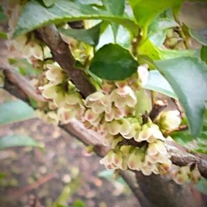 ヒサカキ(姫榊)の花が 咲いてました サカキ(榊)とよく似てますが 葉にギザギザあるので、ヒサカキですね 白い小さな花がいっぱい付いてます 薄いピンクが、白い小さな花の中に〜可愛い〜