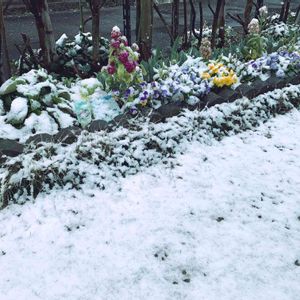 📪ポスト横下に置いてある寄せ植えのプランター➖🎶💖 🌼🍃ビオラと葉牡丹の寄せ植え下には、去年初めてヒヤシンスの球根を植えて…咲きました❣️ そしてそのまま➖植えっぱなし😆 今年もヒヤシンスの芽が🌱出始めましたよぉ〜💕💠💕💠💕 なんて〜良い子なのでしょう‼️👍