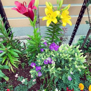 百合の花➖🎶💖😍 オレンジ色➡️黄色➡️ワインカラー➡️白が咲いている。そしてまた黄色🟡・・・ 夫が植えてる百合の花。仏壇に飾っていた😆🤣