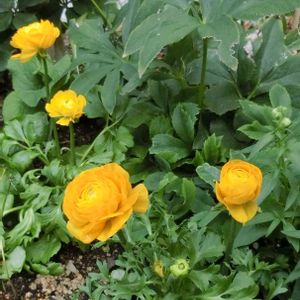 薔薇のように鮮やかな黄色の花びらが幾重にも重なったこの花はラナンキュラスです。 別名はハナキンポウゲ(花金鳳花)とも言います。 ラナンキュラスは500種類位ありますが、その内アシアティクスと言う品種を改良した園芸品種です。 18世紀のヨーロッパで大流行したようで、現在では花色も花姿も豊富です。 暑さには弱く夏の間は休眠します。 中近東・ヨーロッパ南東部原産。 ハナキンポウゲ科ハナキンポウゲ属の多年草。