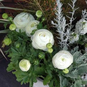 薔薇のように綺麗な薄緑色のこの花はラナンキュラスの園芸品種ラックスシリーズです。 従来のラナンキュラスは高温多湿と寒風が苦手でしたが、宮崎の園芸家によつて改良されたこの品種は耐寒性が強く、露地栽培も可能になりました。 スプレー咲きで次々と花を楽しめます。 中近東・ヨーロッパ南東部原産。 ハナキンポウゲ科ハナキンポウゲ属の多年草。