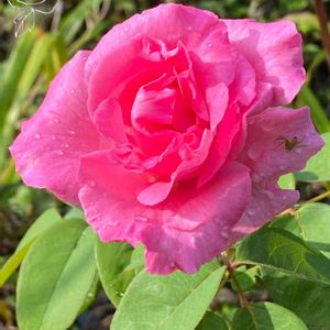 朝見たら、こんなに咲き開いてしまったラフランス🥀 それにこのバラには、花蜘蛛さんが訪問してます❣️ 蜘蛛の巣を張るつもりなんでしょうか⁉️ それともやはり雨宿りかしら⁇