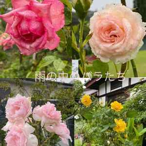 長雨で、せっかく咲いてきた夏バラが、ずぶ濡れです‼︎ 剪定することもできず、スマホで撮るのがやっと‼️ 左上ウェディングベル、右上ピエールドゥロンサール 左下プチトリアノン 右下ヘンリーフォンダだけ車庫 地植えのバラたちは、花びらも溶けそうです!Σ(-᷅_-᷄๑)