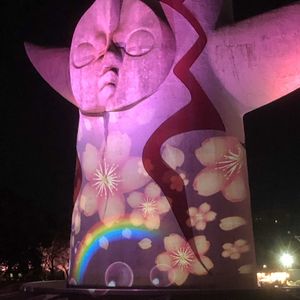 夜桜は「太陽の塔」や道路などにプロジェクション🌸されています。🌃📸🤗😄🌞✌️ あっ帰る時間だ!🏃💨