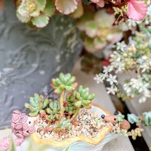 真ん中のツンツンしたセダムのような植物の名前が分かりません🥲どなたか知っていたら教えていただきたいです🌱